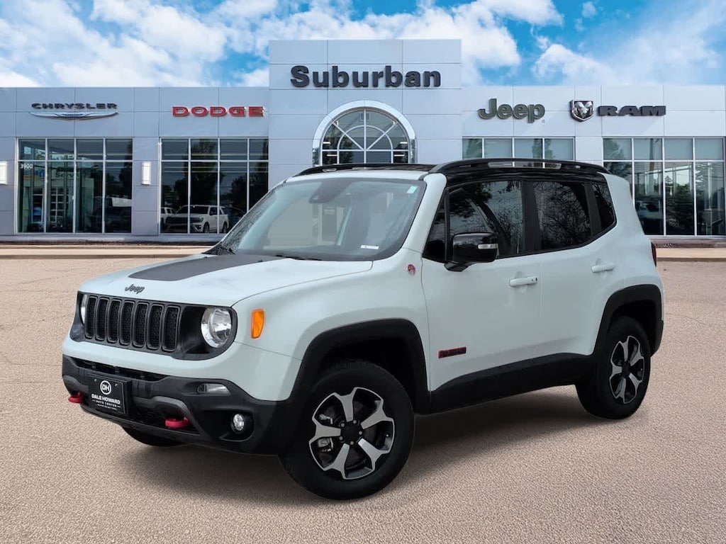 se habla Espanol! Our One Owner 2022 Jeep Renegade Trailhawk 4X4 with Alpine White finish is ready for adventure! Powered by a TurboCharged 1.3 Liter 4 Cylinder generating 177hp for a 9 Speed Automatic transmission protected by its own skid plate. This Four Wheel Drive SUV also boasts Selec-Terrain traction management with a dedicated Rock mode, and it achieves nearly 27mpg on the highway. Additional underbody protection, exclusive Trailhawk graphics, front/rear recovery hooks, fog lamps, alloy wheels, and a black-painted roof add a feeling of fierce functionality to our Renegade.